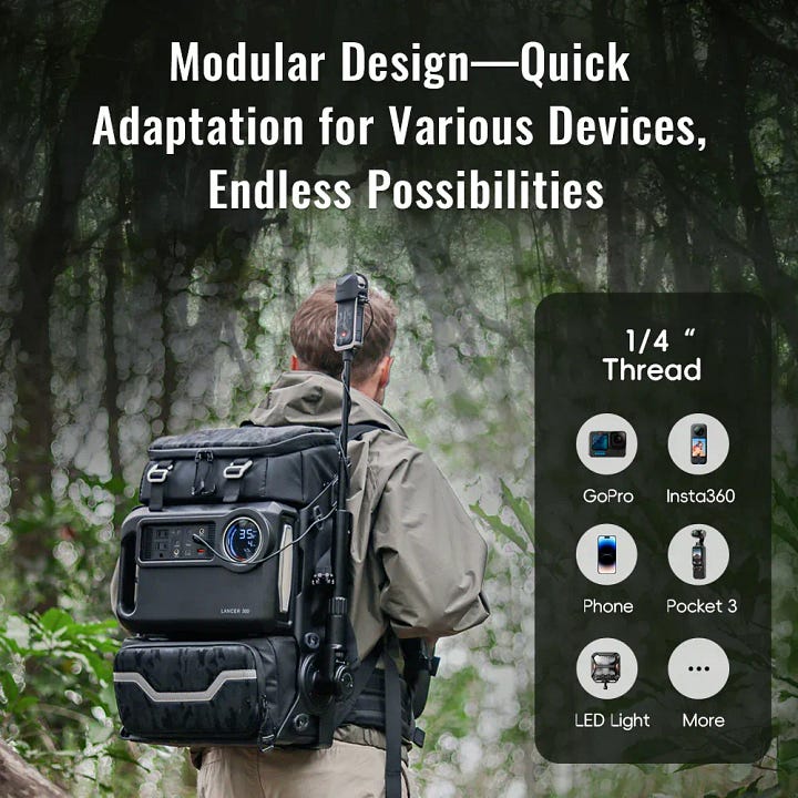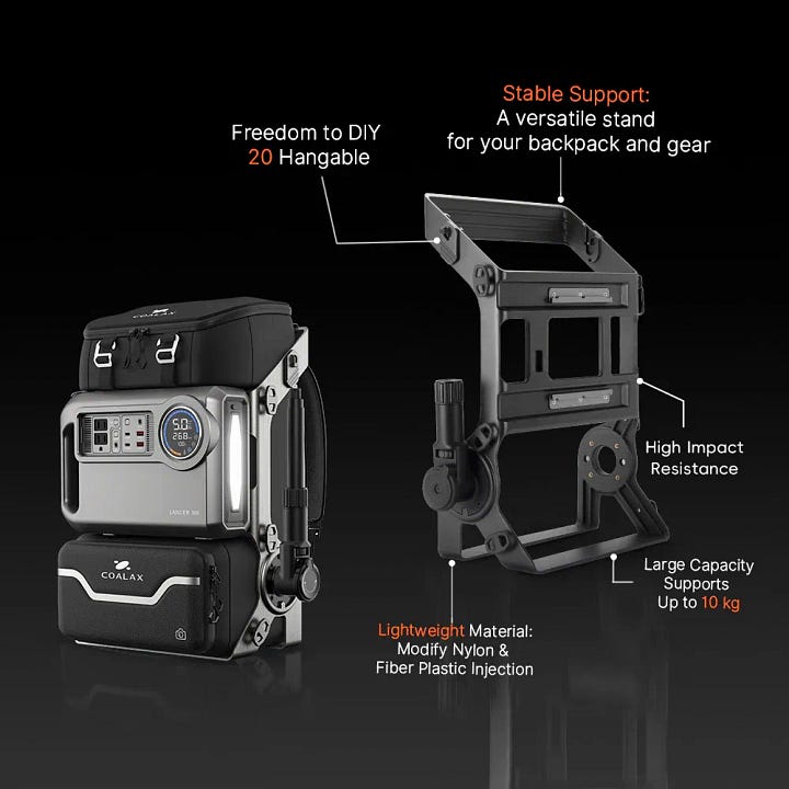 Мечта походников, загруженных электроникой. Тут у нас экзоскелет (типа), взаимозаменяемые модули (это мы любим), переносная аккумуляторная станция, телескопические палки для экшен-камер (забавно, как они в рекламе ходят с ними по лесу) и прочее ненужное.